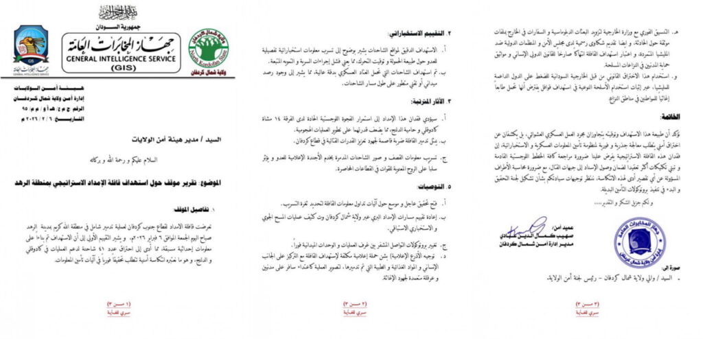 كشفت وثيقة استخباراتية رسمية، نُسبت إلى جهاز المخابرات العامة السودانية، عن أن القافلة التي جرى استهدافها في منطقة الرهد بجنوب كردفان لم تكن قافلة إغاثة إنسانية خالصة كما أُعلن رسمياً من قبل الجيش السوداني، بل كانت تحمل شحنات أسلحة وذخائر نوعية موجهة إلى قوات الجيش السوداني في مسارح العمليات بالولاية.